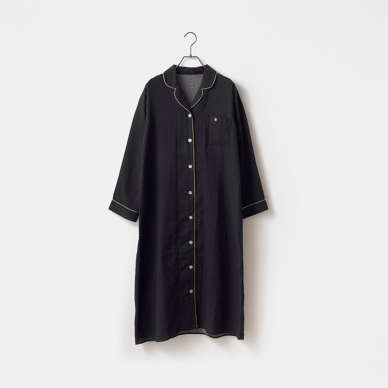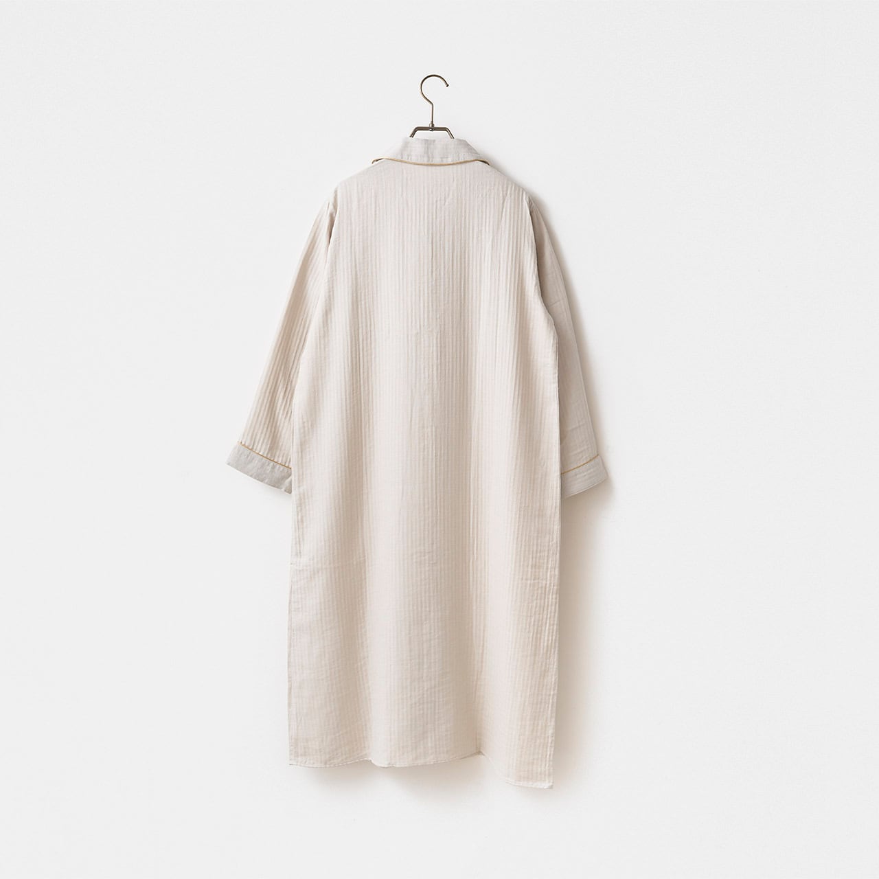 軽くて通気性がよくやさしい肌触りの綿100%の二重ガーゼのルームドレスです。ゴールドのパイピングと胸元の幸せを願う吉祥文様の刺繍の飾りがプレシャスな雰囲気を醸し出した衣香舎を代表するドレスです。ちょっとした外外出にも羽織としても着回しできるおしゃれで便利な一枚です。