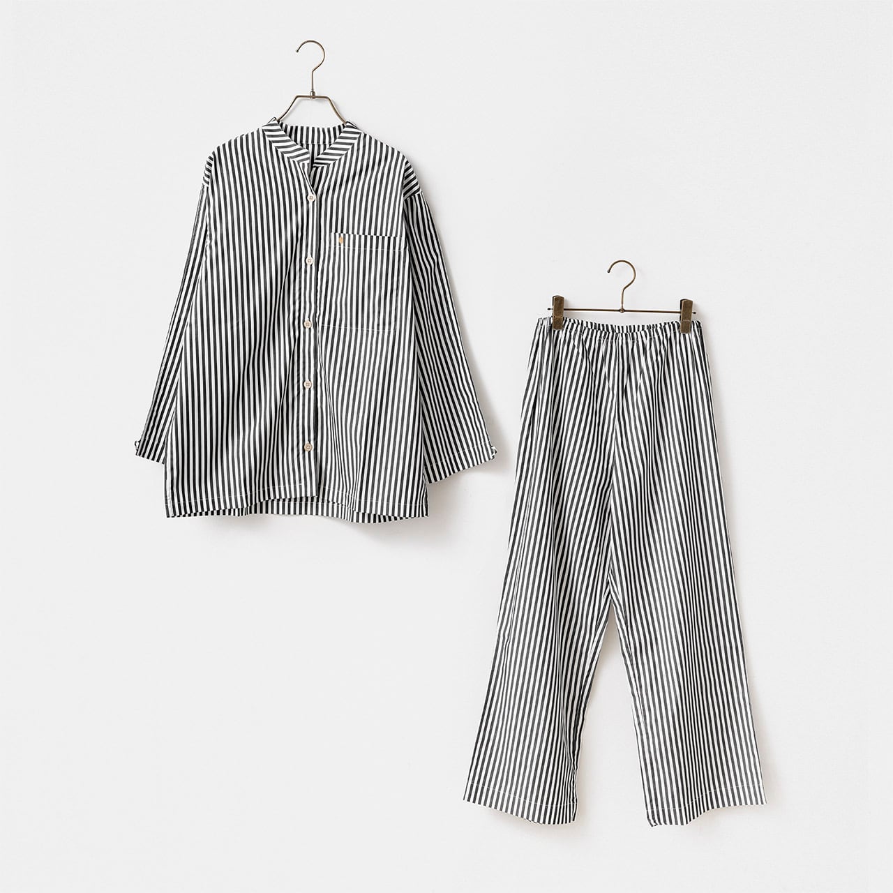 軽くてツルッとした手触りの120/2(細い番手の糸)のスーピマコットン素材の寝間着セットです。セットとしてお家の中でも別々に着用して少し外にもお出かけできるデザインで長いシーズン楽しんでいただけます。首元をスッキリと見せるデザインと全体シルエットの絶妙なバランスがおしゃれ感を演出します。