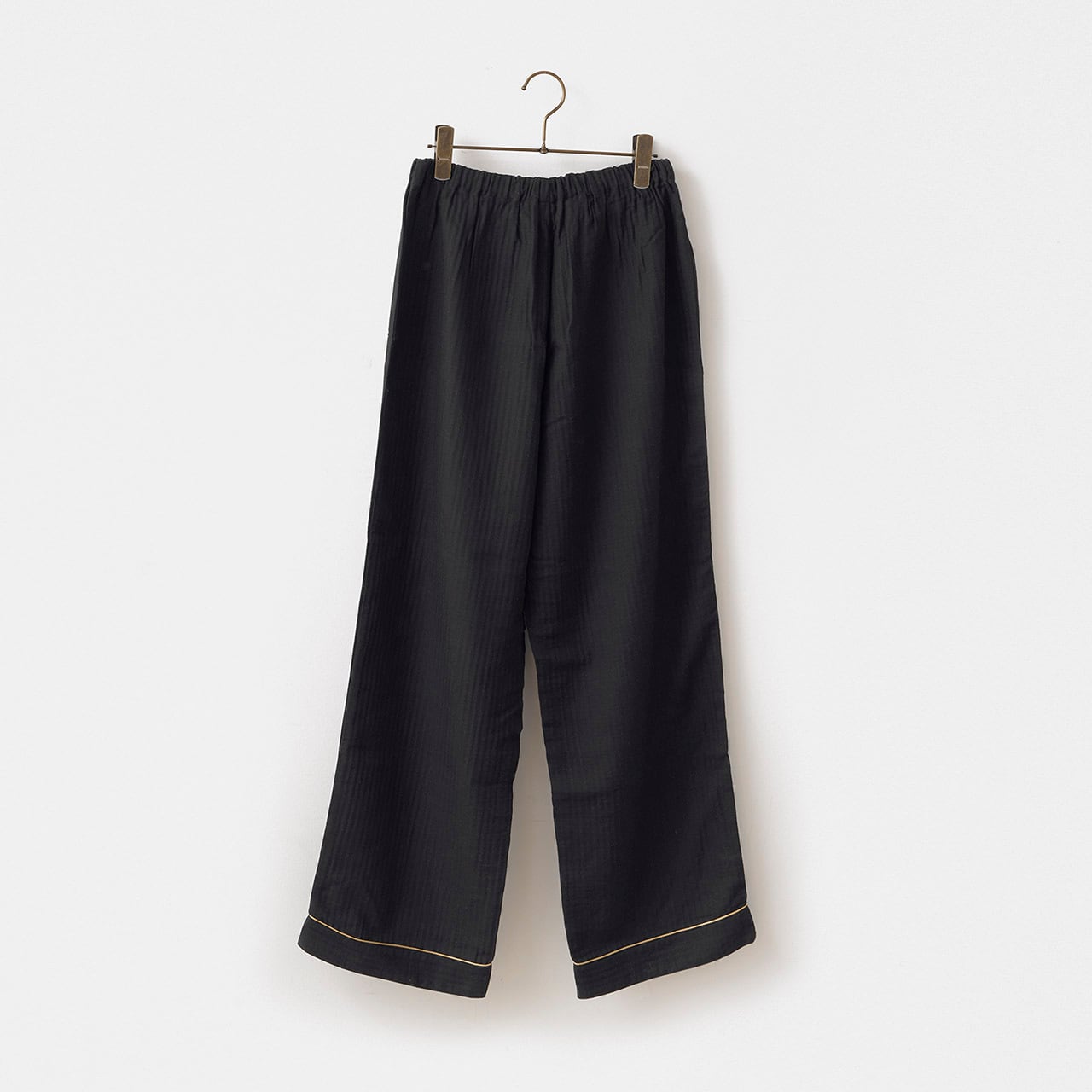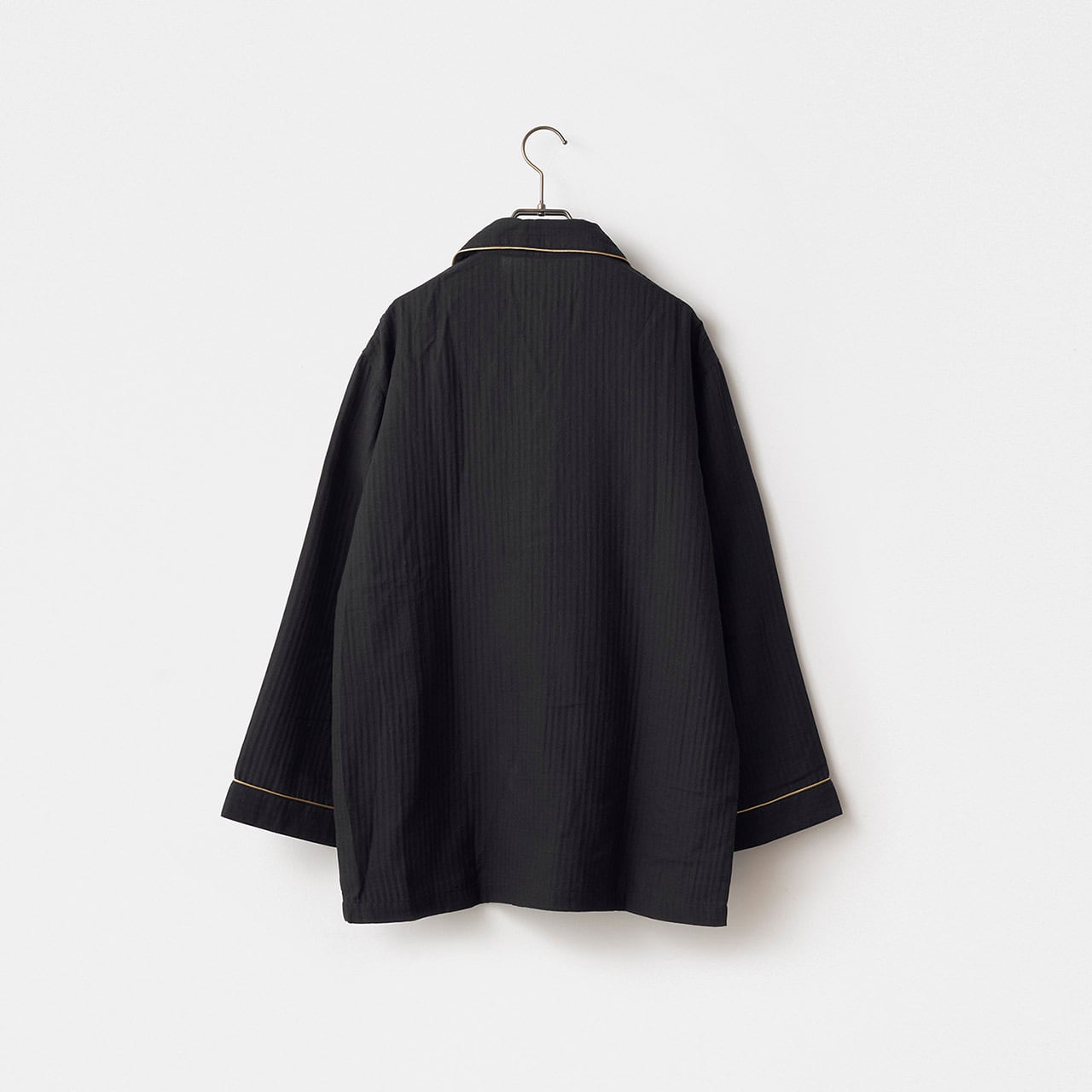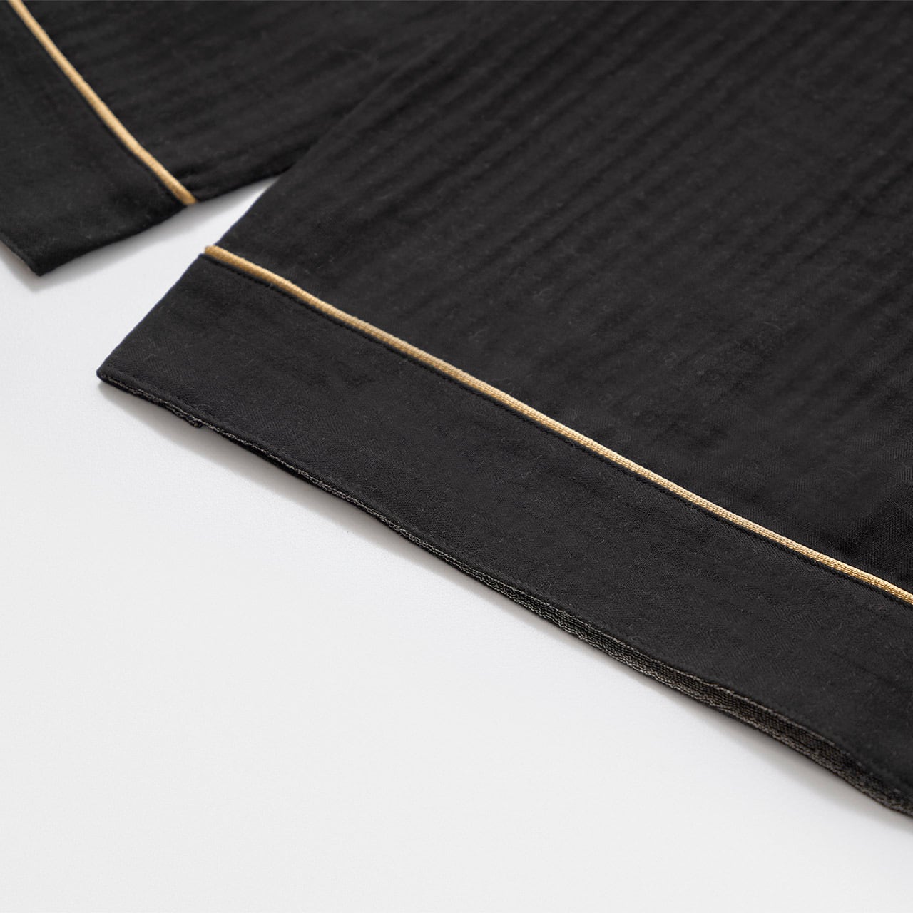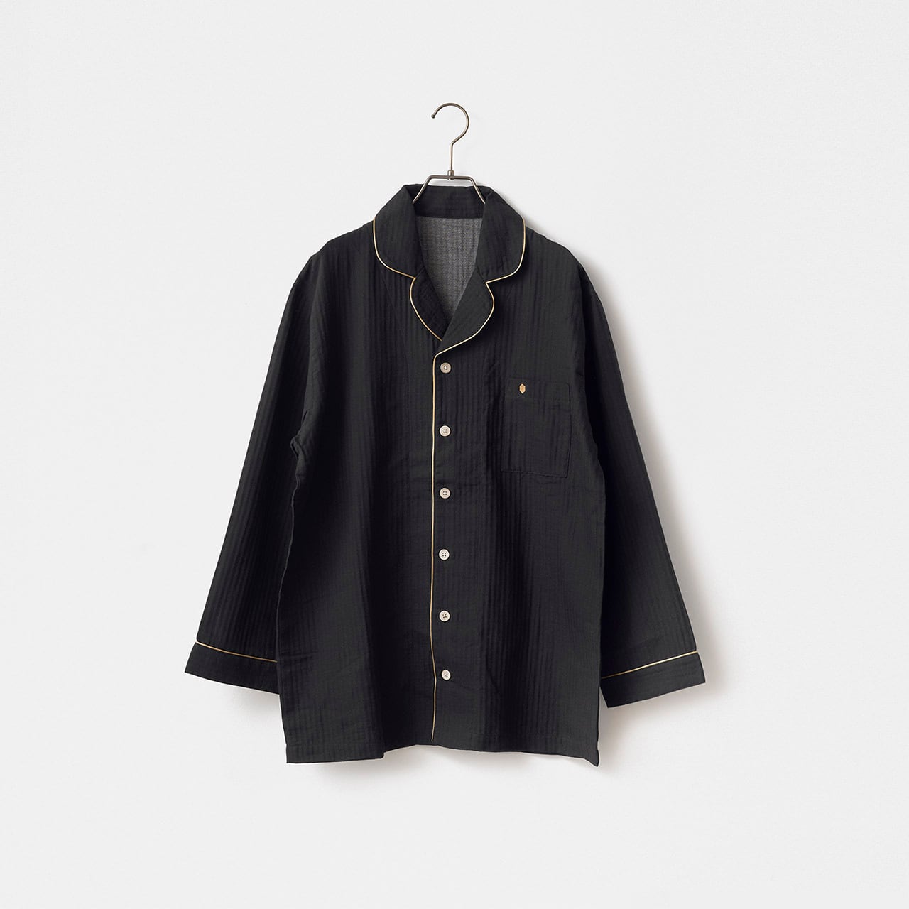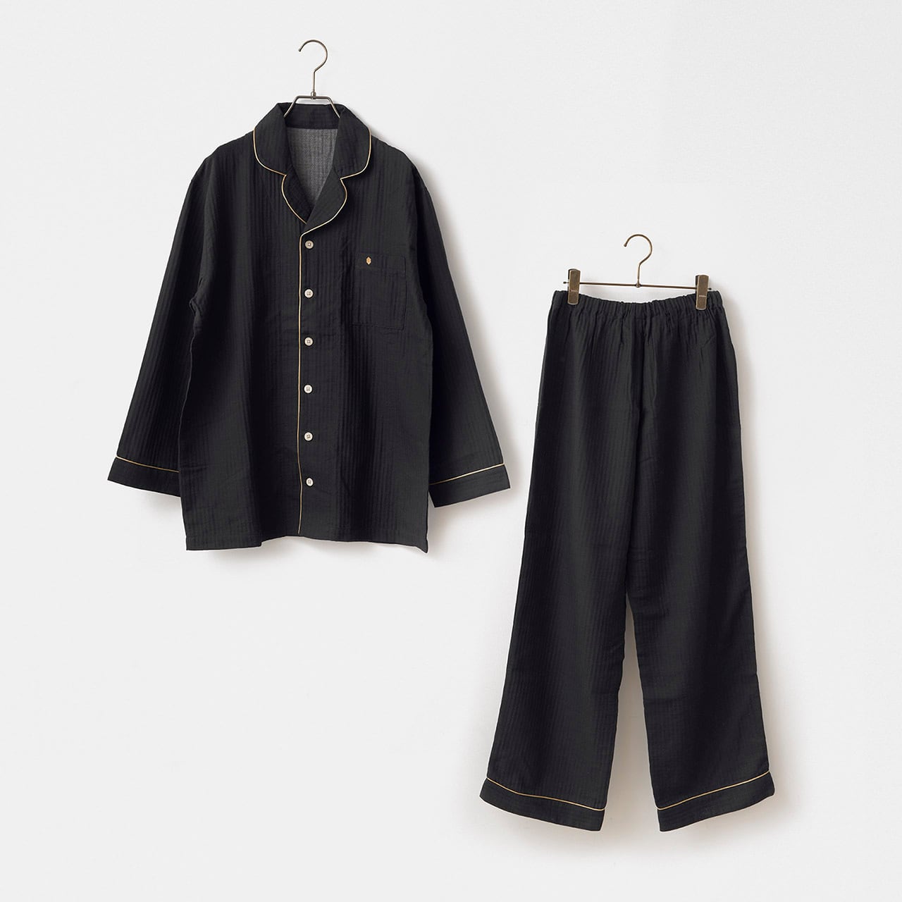 軽くて通気性がよくやさしい肌触りの綿100%の二重ガーゼをメンズ仕立ての寝間着セットです。ゴールドのパイピングがプレシャスな雰囲気を醸し出したおしゃれな寝間着セット。